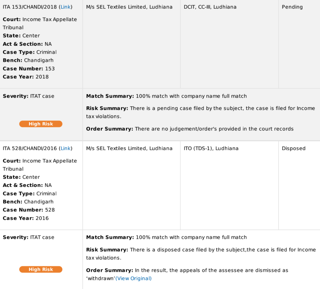 If SEL’s lenders had access to such a report, they would have known that SEL Textiles had 60 registered cases. Between 2015 to 2018, SEL was involved in multiple income tax violation cases in the ITAT (Income Tax Appellate Tribunal).